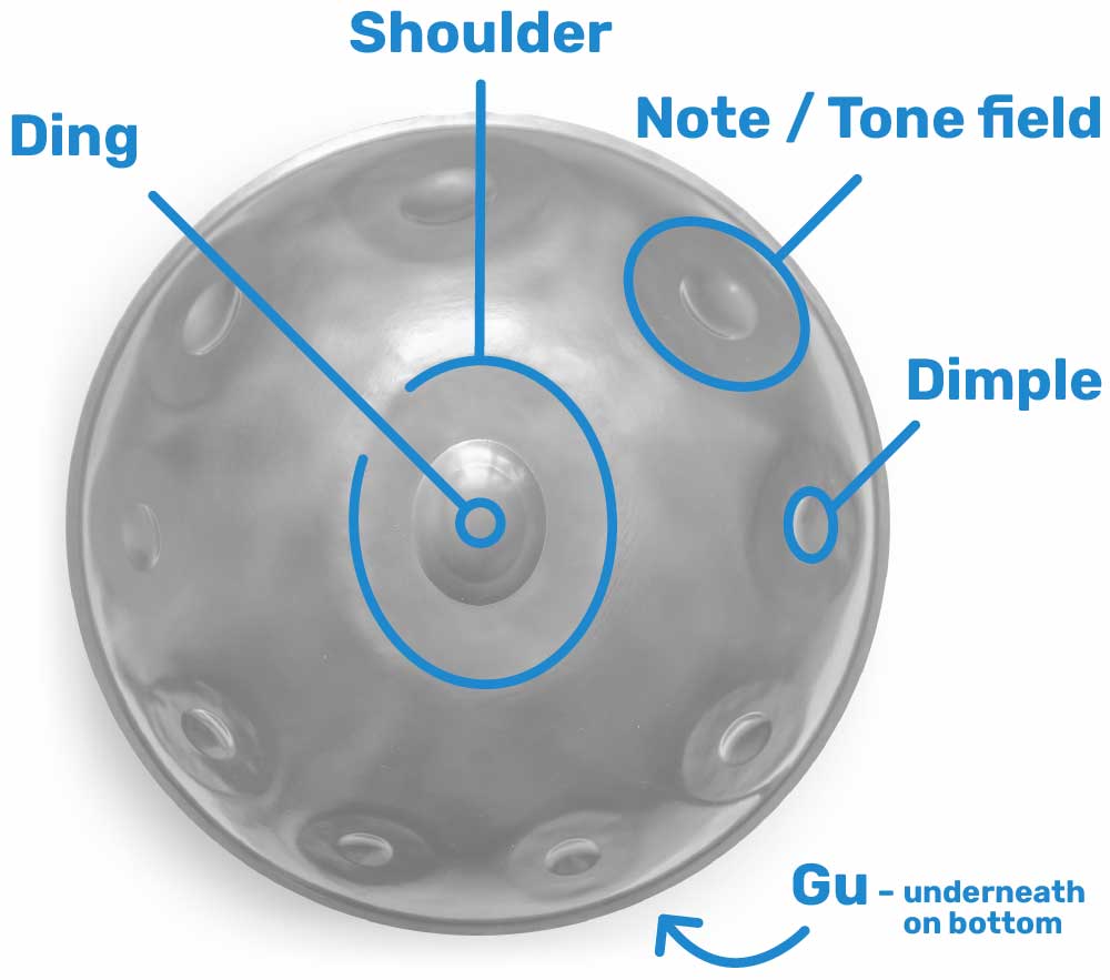 La forma base della handpan si basa sull'Hang®. È costituito da due gusci metallici circolari, uniti insieme. La parte superiore è costituita da un campo tonale centrale, chiamato "Ding" (il tono più basso al centro) e solitamente da 7-10 campi tonali ovali sul cerchio esterno. Sulla maggior parte degli strumenti, il "ding" è curvato verso l'esterno/verso l'alto e il centro del tono rimanente delimita la "fossetta" verso l'interno. Al centro del fondo c'è il "Gu (buco)" da cui esce il suono.